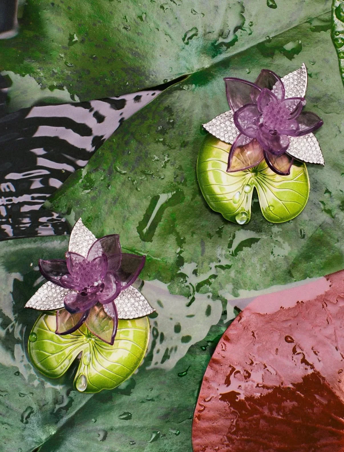 A greenhouse structure was constructed over the water lily pond at the Jardin des Tuileries, creating a transparent architectural volume where water, light, and botanical elements became part of the runway narrative. Reflective surfaces and layered vegetation allowed the environment to shift throughout the show, echoing the fluid movement and romantic silhouettes of the collection.